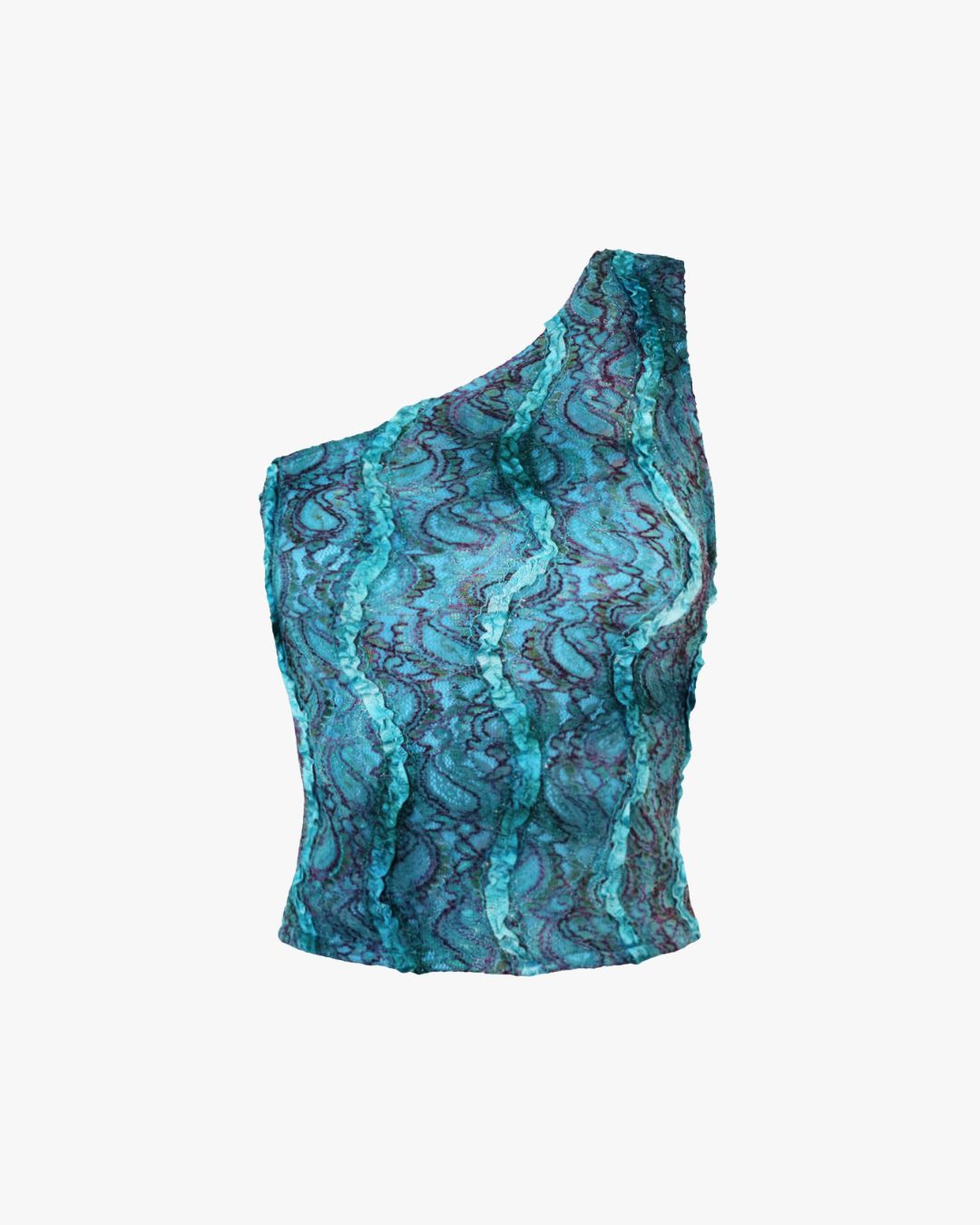 Dalias, este es el nombre que representa este diseño irregular de top con una sola manga que recuerda la moda de los 80 y 90 con un tejido de gasa de encaje elástica hecha a mano en Europa de edición limitada con malla, nailon y fibra spandex (elástica en cuatro direcciones)