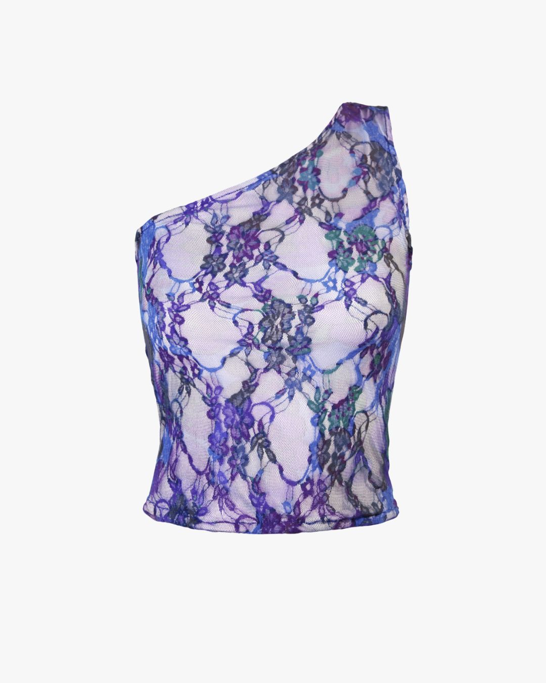 Lavanda, este es el nombre que representa este diseño irregular de top con una sola manga que recuerda la moda de los 80 y 90 con un tejido de gasa de encaje elástica hecha a mano en Europa de edición limitada con malla, nailon y fibra spandex (elástica en cuatro direcciones)